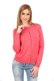 - Solid button-front cardigan featuring metallic buttons and fine rib-knit trim