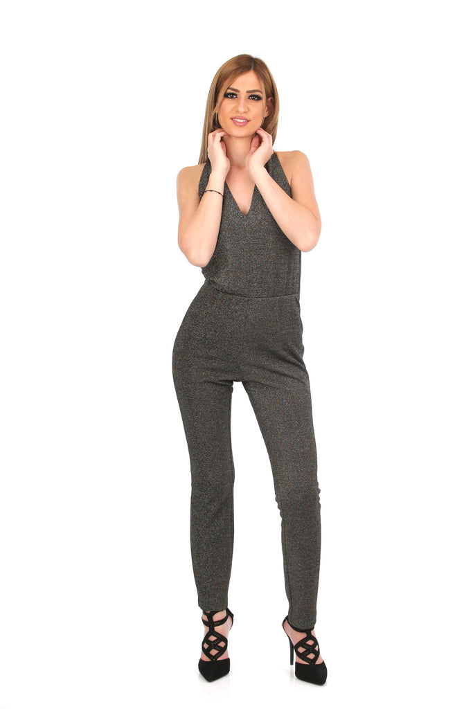 Long jumpsuit in stitch lurex fabric, ‘V’ neckline on the front and back, Comfort fit, with hidden elasticated band at the waist, cord detail on the back with gold appliqué and Fly.