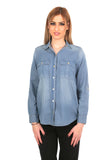 Epaulets and pleated chest pockets add military style to a roll-sleeve shirt cut from faded denim chambray accented with shiny Goldtone snaps.