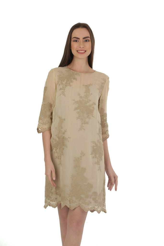 - Georgette mini dress with relief yarn embroidery, detachable slip with adjustable straps