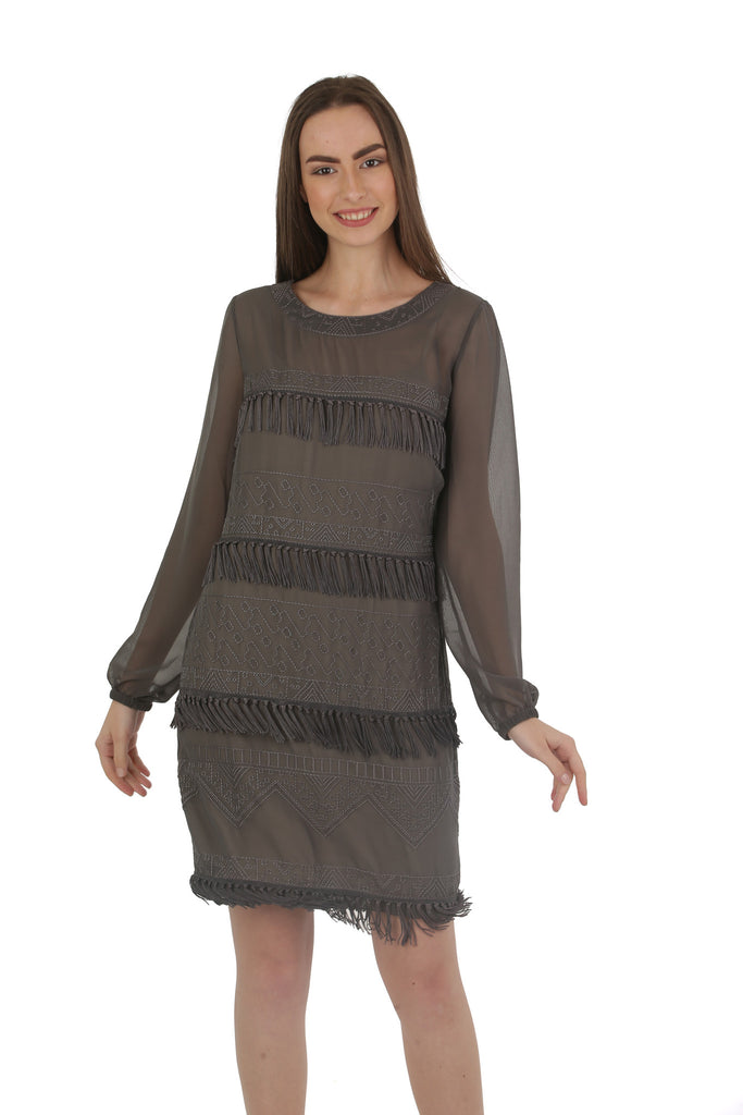 - Details: tulle, crêpe, solid color, long sleeves, round collar, buckle, beaded detailing, no pockets, lined interior, rear closure, button closing, trapeze dress