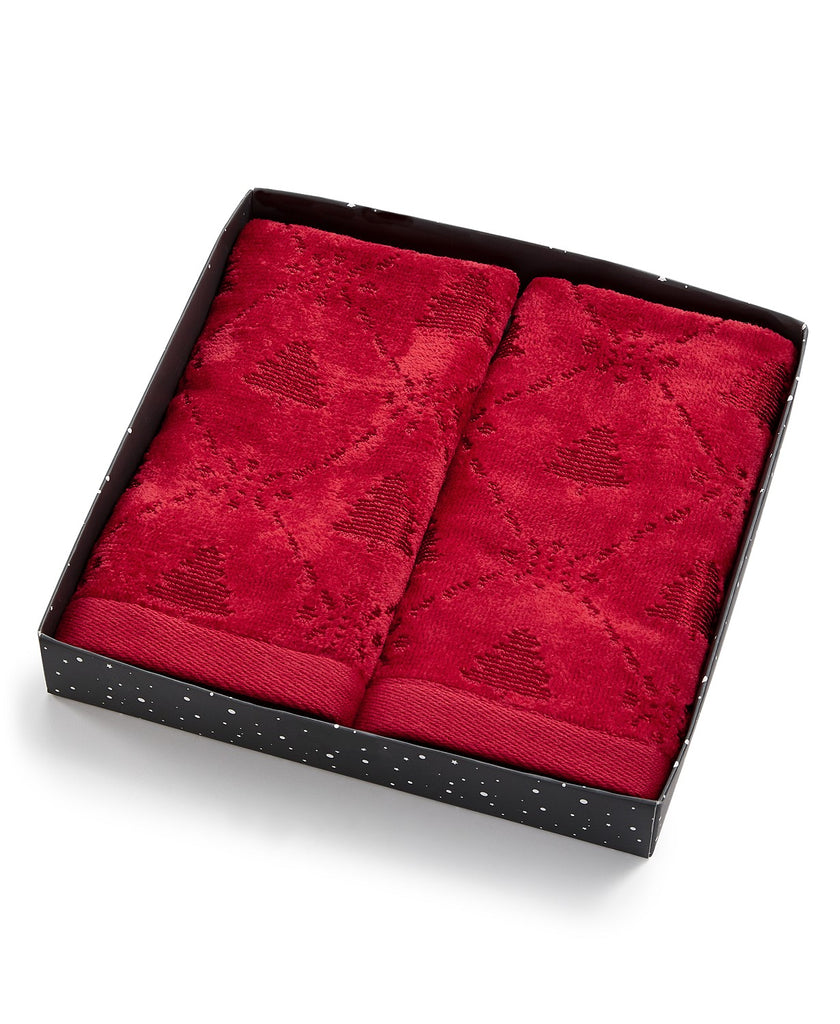 Bring a cheerful look and feel to your bath with the rich red tone and festive snowflakes and trees featured on this soft cotton fingertip towel set from Martha Stewart Collection.