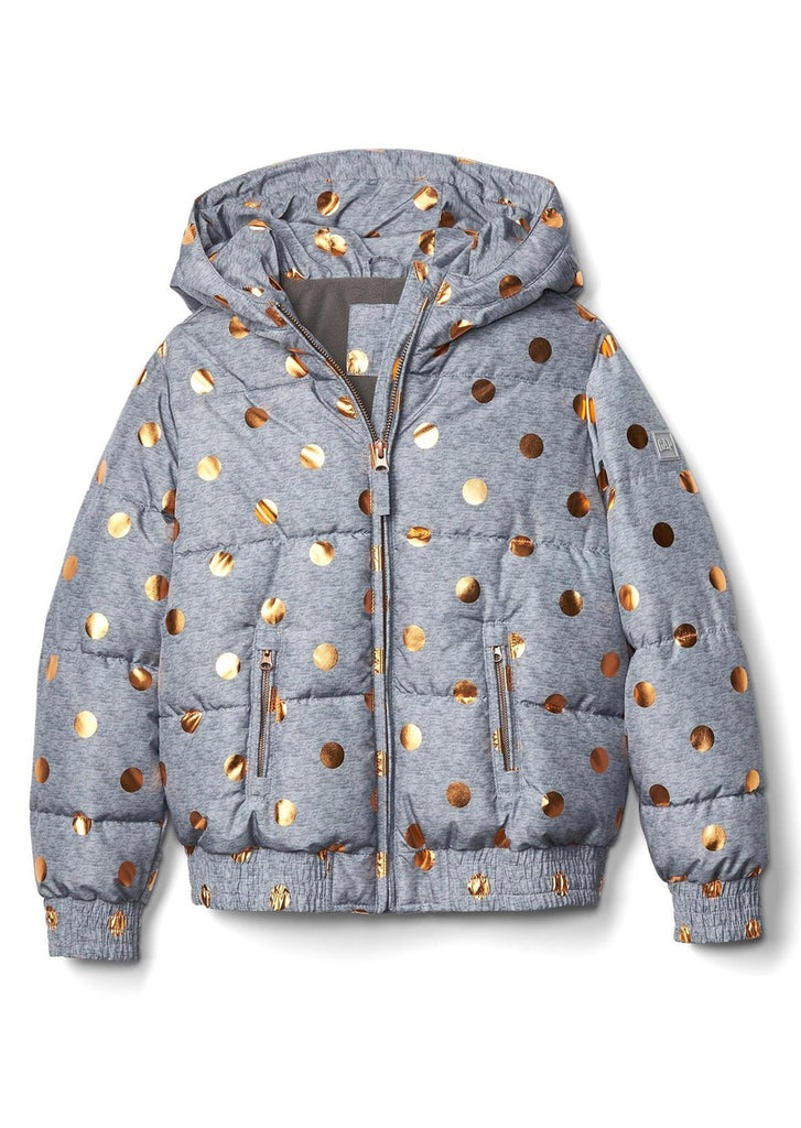 The cutest polka-dot-print puffer coat ever, made even more awesome with extra-cozy and cool details, like fleece-lined pockets, a hidden zip closure.