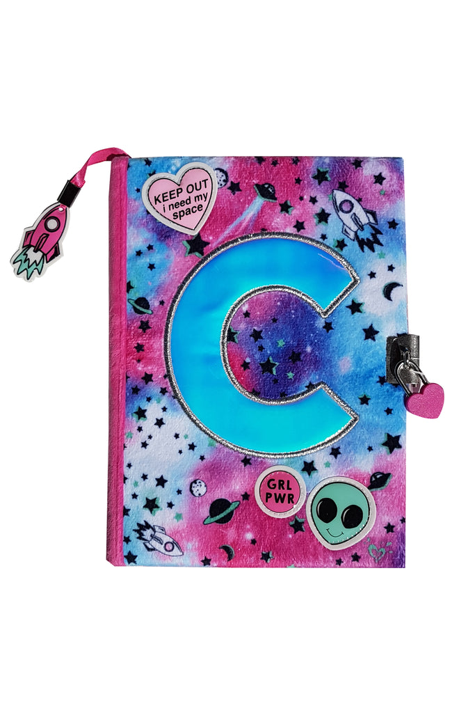 - Soft, fuzzy background features galactic theme and embroidered plastic patches