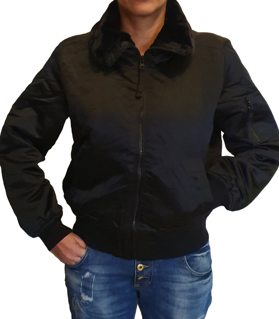 - Soft, plush faux-fur trim at wide stand collar. Full zip closure.