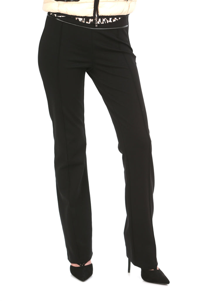 High-waisted trousers in viscose stretch jersey, straight line, pleated at waist, eco-leather piping details.